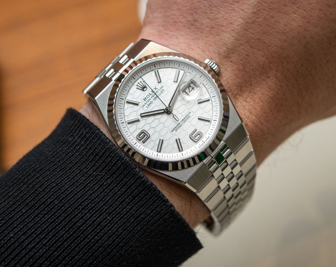 First, a quick recap of the basics, with more in our debut article. The Rolex Land-Dweller is new replica watches UK collection for 2025 that comprises two case sizes, 36mm and 40mm, and three material options for the exterior, White Rolesor (a combination of Oystersteel for the case and bracelet, and 18k white gold for the bezel), all-Everose gold (Rolex’s proprietary 18k pink-gold alloy), and all-platinum with, you guessed it, an Ice Blue dial.