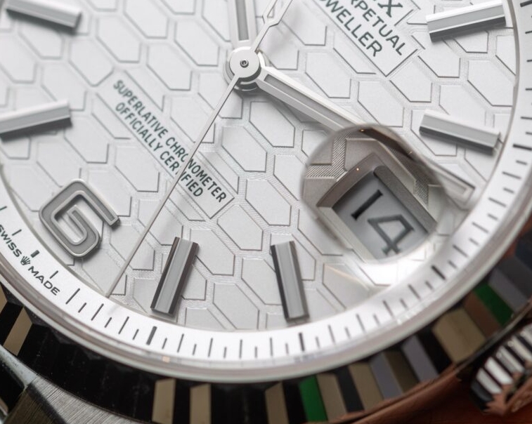 The dial is a developed taste. Its femtosecond laser-cut pattern is busy, and while it is meant to be defined by hexagons, you will find many of them chopped up by hour markers, cut off by rectangles and “podiums” that carry lines of text. Somehow, integrated bracelet Swiss Rolex replica watches almost always seem to attract busy dials — and we firmly believe the Land-Dweller would have benefitted from a slick lacquered or sunburst-finished dial option. Rolex had this idea back when it designed the Date 1630; look it up and see for yourself just how well that package works. The hour markers are as new as they are open-ended. To stop the Chromalight luminous paint from flowing out, Rolex first manufactures these as regular hour markers and then cuts both ends off to create this open look.