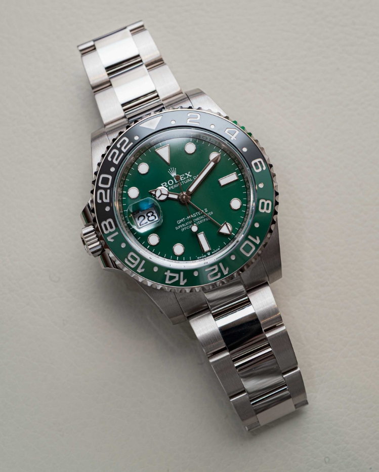 Rolex’s anniversary pieces are hardly ever explicitly branded as such, and it is generally just their colors and design cues that hint at their commemorative nature. For example, the Submariner 16610LV “Kermit” was released in 2003 to celebrate the collection’s 50th anniversary; however, it was simply fitted with a green bezel and an updated style of dial to denote its anniversary-related inspiration. Given its firmly luxurious construction and bright green ceramic dial, the GMT-Master II 126729VTNR feels like an appropriate way to celebrate the 70th anniversary of the original GMT-Master, although it doesn’t include any commemorative markings, and it could just as easily be described as the precious-metal version of the original left-handed black and green GMT-Master II from 2022.