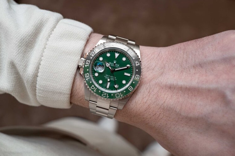 Since stainless steel and white gold can look somewhat similar at a quick glance, Rolex often pairs its white gold models with bezels or dials that visually separate them from their more humble stainless steel counterparts. For example, the white gold version of the red and blue GMT-Master II “Pepsi” is currently only available with the option of either a blue dial or one crafted from meteorite (neither of which is available for the stainless steel “Pepsi” model), and the white gold Submariner is fitted with a blue bezel, which isn’t a color that appears on any of the stainless steel models from the collection. Rolex doesn’t want to make white gold replica watches UK that is otherwise completely identical to one that is crafted from stainless steel, and the white gold version of the black and green left-handed GMT-Master II would therefore naturally be fitted with a matching green dial.