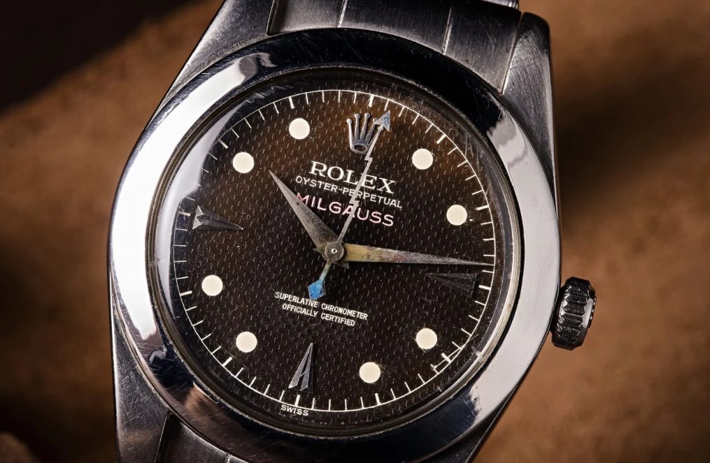 Rolex created the Milgauss exclusively for scientists and engineers who worked under high-magnetic-environment conditions, as high magnetic forces can interfere with the accuracy of a mechanical watch. “Milgauss” is the term used to describe the resistance to 1,000 gauss of magnetic force, a feat obtained through the use of a Faraday cage (soft iron inner case) that protects the movement. The Rolex 6541, introduced in the late 1950s, was one of the first Milguass models.. Inside most examples of that model is the caliber 1066.